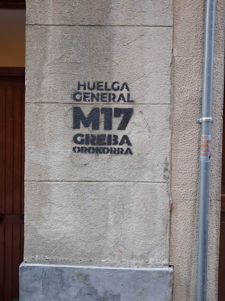 No estoy en contra de la huelga, ni de la actividad sindical. Si de la expresión de los secretarios generales de ELA y LAB de “la huelga por la huelga” y de manchar las paredes irrespetándolo todo, ya que esa pintada habrá que borrarla y costará un dinero. ¿Lo harán los convocantes?.
