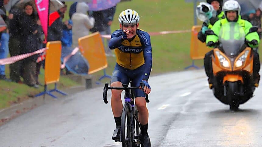 “Ha sido una carrera de locos, con mucho frío niebla y lluvia. En la primera subida, el Finisher trató de marcar los tiempos, pero en la bajada conseguí coger mi ritmo, se rompió el pelotón y quedamos 30 corredores en cabeza. En el puerto de antes de Gorla, arranqué a falta de 100 metros de coronar, me lancé en el descenso y me siguieron Íker Pérez del Caja Rural y Pedri Crause del Natural Greatness. En el ascenso definitivo a la meta de Gorla me fui en solitario hasta arriba, manteniendo el ritmo hasta el final para lograr la victoria. Estoy muy contento”, explicaba feliz, Aimar Tadeo, antes de subir al podio para celebrar su primer triunfo como corredor del Equipo Cortizo.