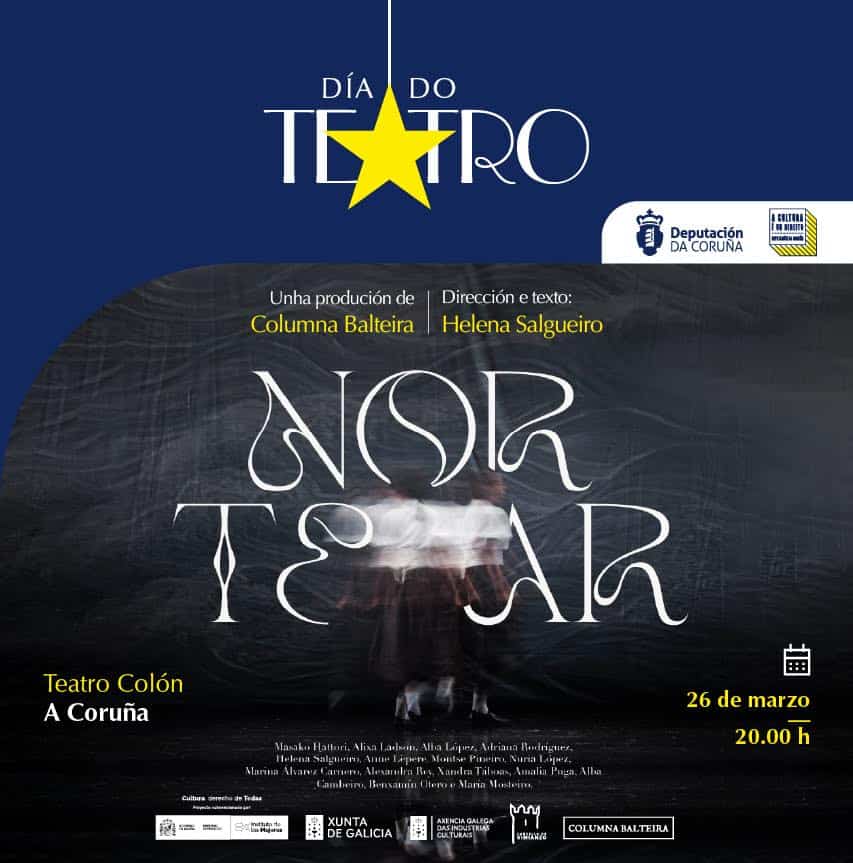 A Deputación da Coruña conmemora o Día Mundial do Teatro coa programación da peza Nortear, unha produción de Columna Balteira con dirección e texto de Helena Salgueiro, que se representará o próximo xoves, 26 de marzo, ás 20:00 horas, no Teatro Colón. Os billetes para asistir á representación xa están á venda, con prezos que oscilan entre os catro e os oito euros.