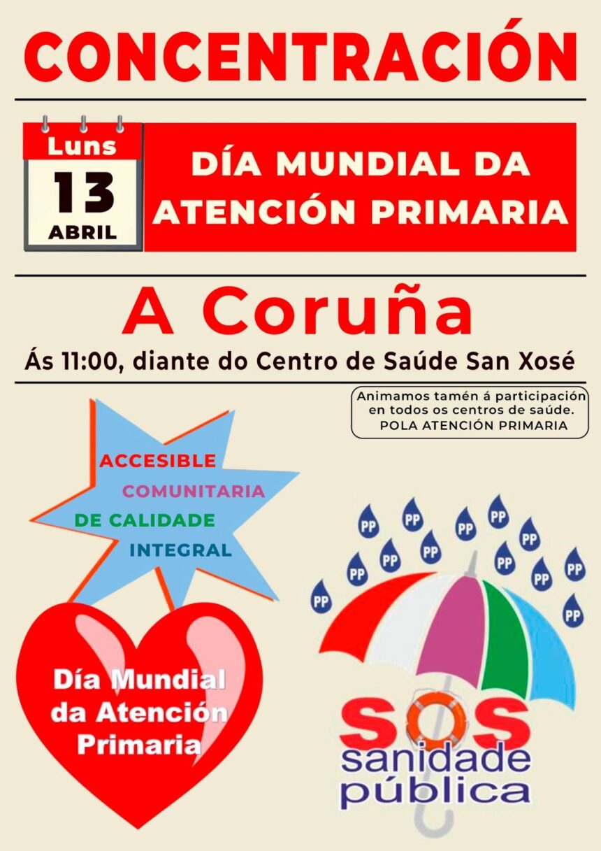 A Plataforma SOS Sanidade Pública Galega convoca concentracións en toda Galicia o luns 13 de abril, reivindicativas, en conmemoración do Día Internacional da Atención Primaria.