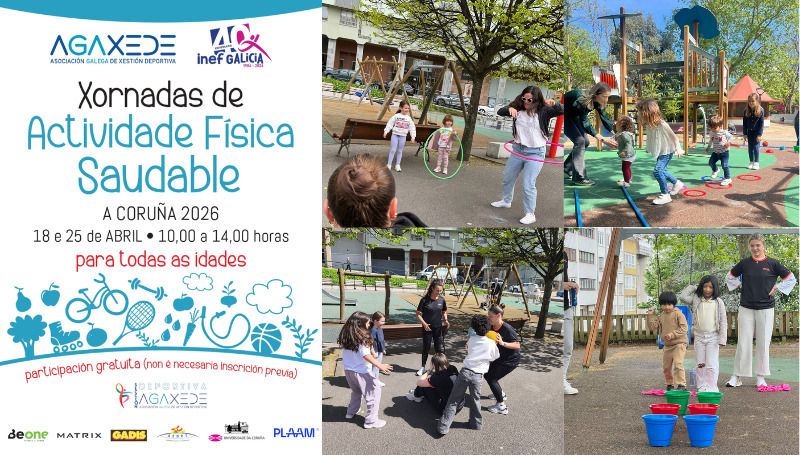 En la mañana del sábado 18 de abril, entre las 10:00 y las 14:00 horas, se celebró la primera Jornada de Actividad Física Saludable en los parques biosaludables ubicados en la Plaza Elíptica de Los Rosales, Novo Mesoiro y la zona del anfiteatro de Santa Margarita de A Coruña. Actividad organizada por la Sección Deportiva de AGAXEDE (Asociación Galega de Xestión Deportiva), con el apoyo de las entidades colaboradoras JIM SPORTS, GADIS, BEONE, MATRIX y PLAAM.