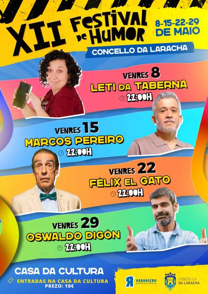 18 de abril de 2026. O Festival de Humor da Laracha regresa no mes de maio, consolidado xa como un clásico da programación cultural municipal tras máis dunha década facendo rir ao público. A 12ª edición volverá traer á Casa da Cultura un cartel de alto nivel, variado e pensado para chegar a públicos diversos, mantendo a aposta do Concello pola comedia de calidade da man de Rababiero Promocións Artísticas.