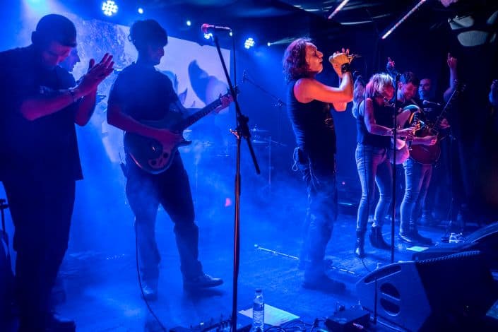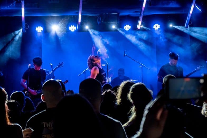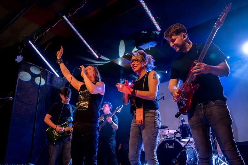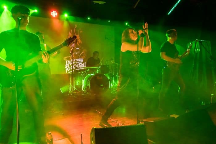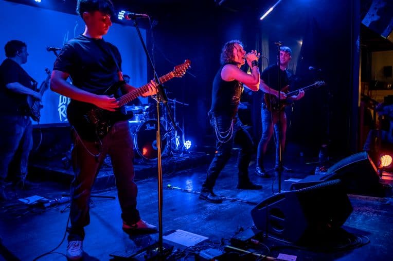 Hubo un momento —difícil de señalar, imposible de olvidar— en el que el concierto dejó de ser una sucesión de canciones y se convirtió en una corriente. Bailando con las ratas, Se fueron sin conocernos e Insert Coin llegaron como un bloque compacto, casi sin fisuras. Había ecos de Iron Maiden en algunas guitarras, sí, pero sobre todo había una identidad propia, reconocible, firme. La batería de Hugo caía como una lluvia constante. El bajo de Miguel empujaba. Y la voz de Jesús empezaba a jugar en un terreno más amplio, más arriesgado.