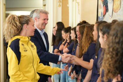 Jugadoras y técnicas del Deportivo Abanca, que ayer ascendieron a primera división, fueron recibidas por Alfonso Rueda