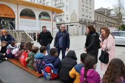 Rubén Arroxo e Cristina López reciben a un grupo de estudantes do Colexio Casás que visitaron a Praza de Abastos e o Mercado Municipal